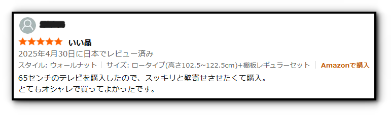 低価格帯のテレビスタンドとは違い、見た目がすっきりしてインテリアにも合うとのことです。デザインと質感のバランスに満足している様子が伝わります。