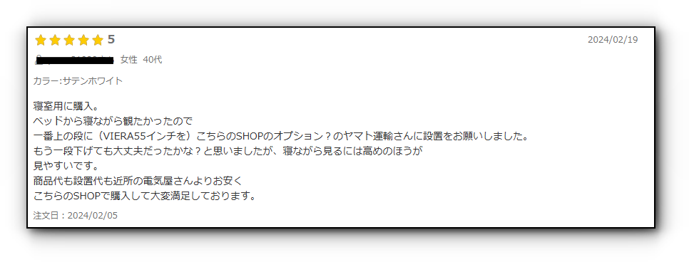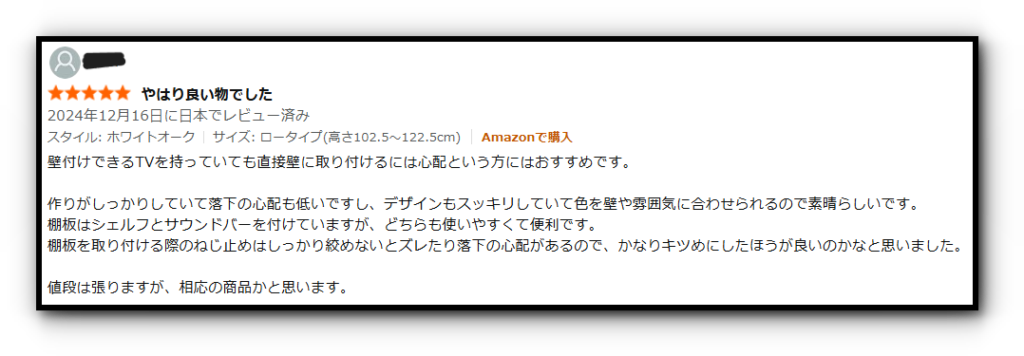 口コミを見ると、壁掛け風の美しい見た目、圧倒的な安定感、配線が見えない快適さがそろっており、安価なテレビ台から買い替えた人ほど満足度が高い傾向があります。