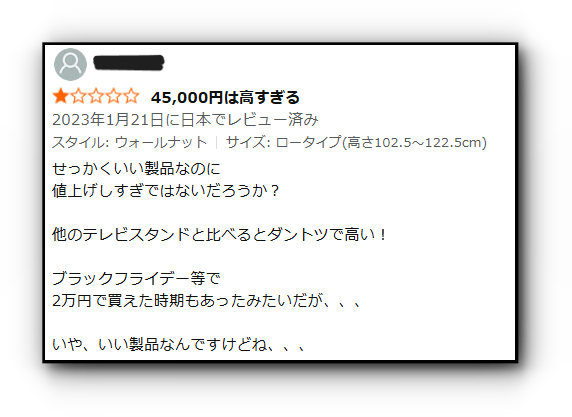 一般的なテレビスタンドと比べると確かに高めですが、口コミを見ると「高いけど作りはしっかりしている」「見た目の高級感と安定感を考えれば納得」という声も多く、安さ重視ではなく高級感とデザイン性を重視する人向けの商品だと分かります。