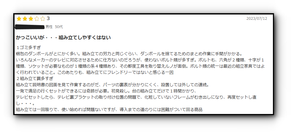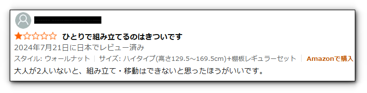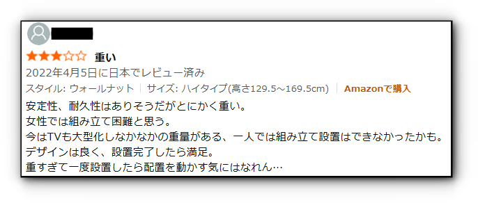「大人が2人いないと組み立てや移動は厳しい」「女性一人では組み立てが大変」といった口コミがあり、特に大型テレビを設置する場合は1人作業が難しいと感じる人が多いようです。