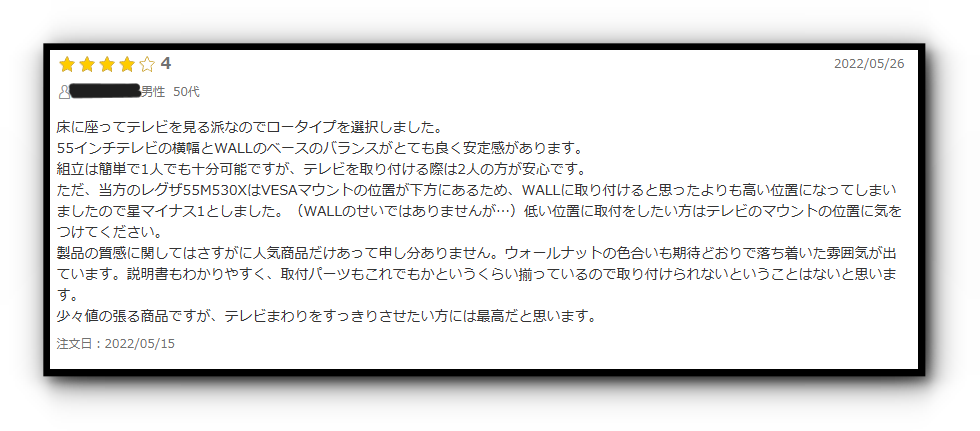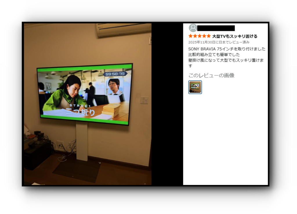 WALL V3ハイタイプは、「大型テレビでも圧迫感なく、壁掛けのようにスッキリ設置できる」という口コミが多く見られます。