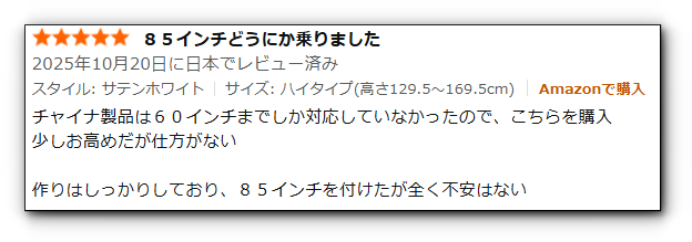 「85インチを載せても不安がない」「土台が重くてぐらつかない」「倒れそうな心配がない」といった口コミが多く、大型テレビでも安心して使える設計になっています。