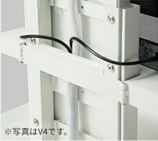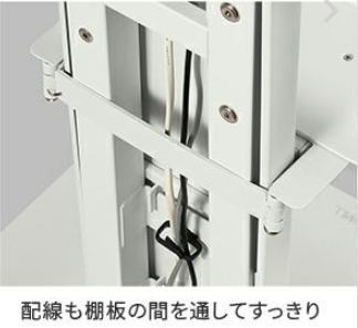 オプション棚を付けた場合、棚の上に置いた機器の配線を通す逃げ道が用意されていないとの記載がありました。どの棚のことかは不明ですが、配線はスタンドの背面に収納することは可能です。