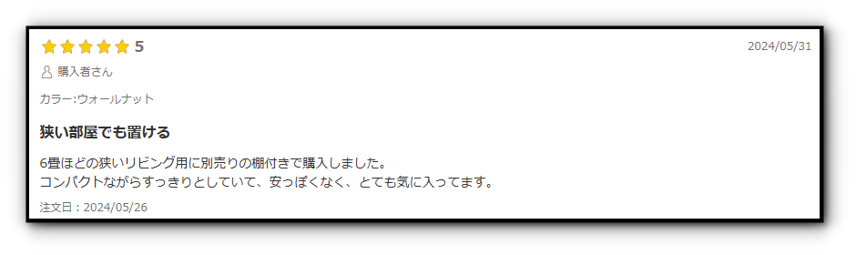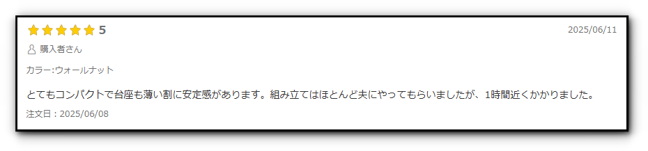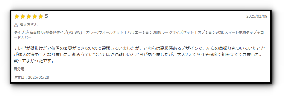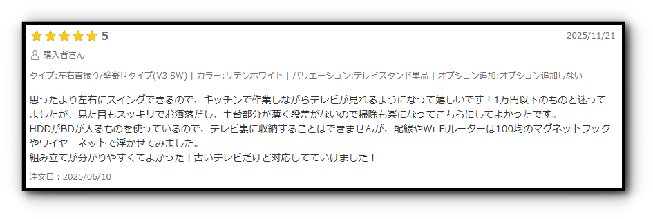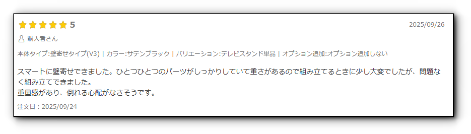 「塗装がきれい」「部品の精度が高い」「梱包や説明書が丁寧」など、メイドインジャパンらしい品質の高さを評価する口コミも多く見られます。単なるテレビスタンドではなく、高級家具のような仕上がりだと感じているユーザーが多いのも印象的です。