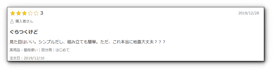 一部の口コミでは、「見た目は良いが、本当に地震で大丈夫か少し不安」といった声もあります。結論大丈夫です。こちらで耐震性についてさらに解説しています。