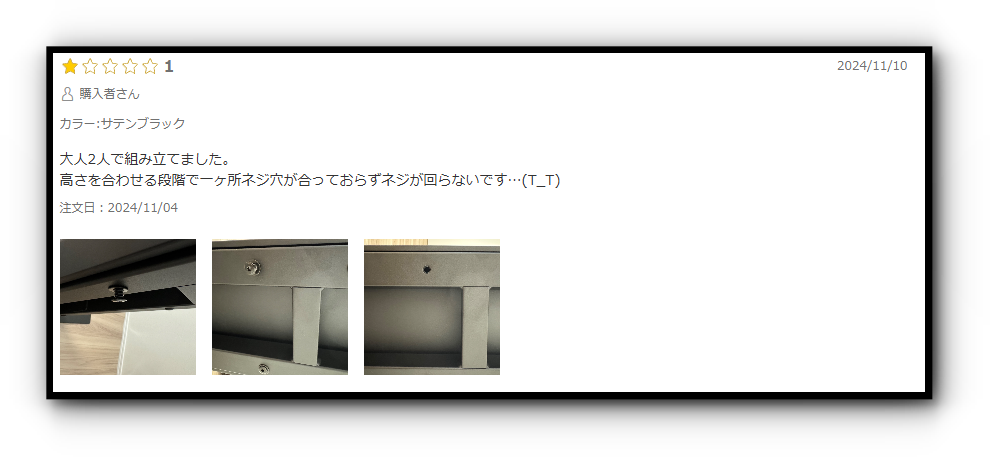 口コミを見ていくと、ごく一部ですが「ネジ穴が合わない」「部品が足りない」といった初期不良の声も確認できます。これはWALLに限らず、Amazonや楽天のようなモール販売では在庫の回転が速く、検品が行き届きにくいことで起こりやすい問題です。