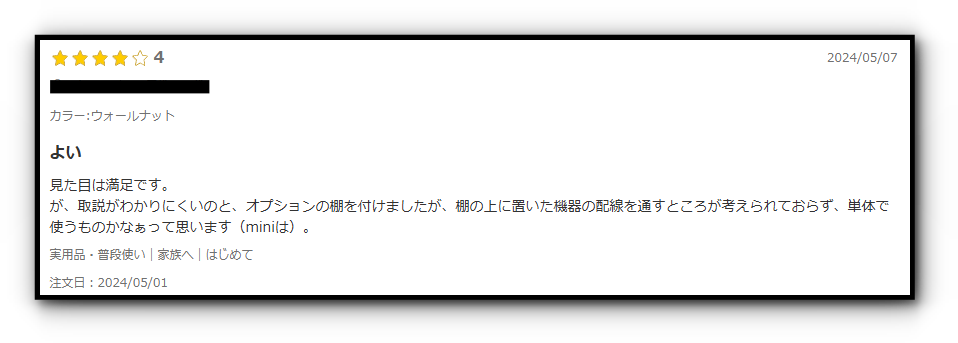 まず「棚や機器を載せすぎるとダサく見える」という口コミです。