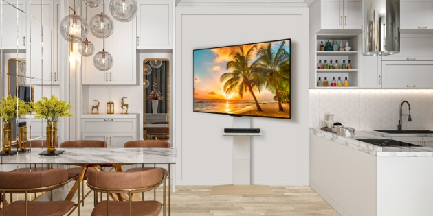 左右の首振り機能を搭載した「V3 SW」。テレビの向きを最適な角度に調整できます。ハイタイプ仕様のため、ダイニング・キッチンからの視聴や、立ち姿勢での作業中にもテレビを快適に見られる高さを確保。