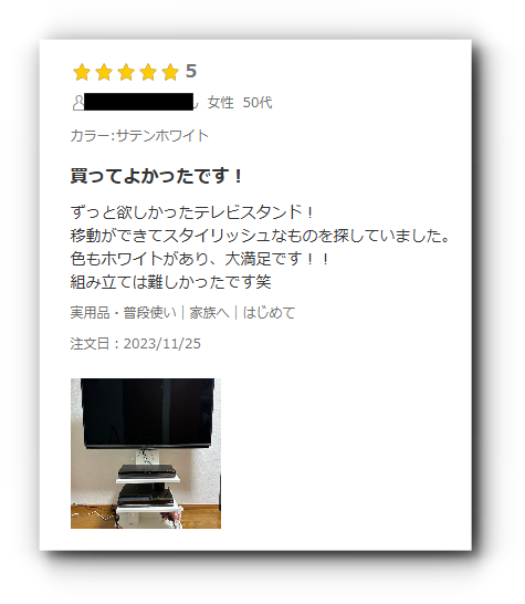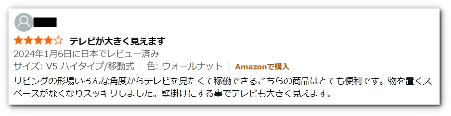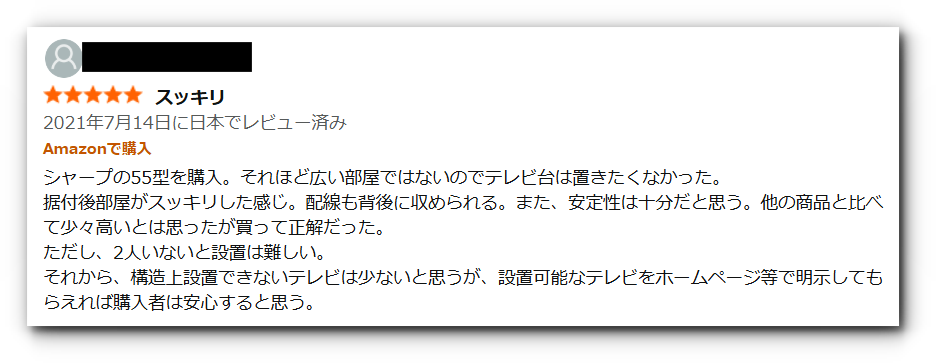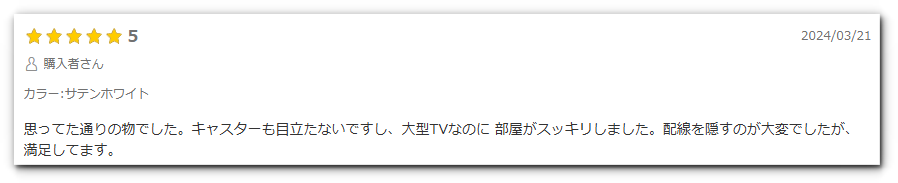 多くのユーザーが「質感やデザインが良い」「大型テレビでも圧迫感なく設置できる」「移動や掃除がラク」といった良い口コミを投稿しており、高評価(★4〜5)が目立っています。