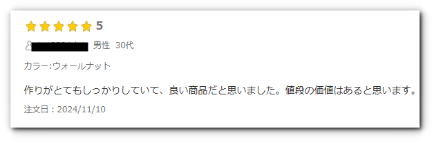 「安っぽさがなく、値段なりの価値を感じる」「しっかりした作りで安心感がある」といった声が見られ、品質面に対する満足度は高めです。