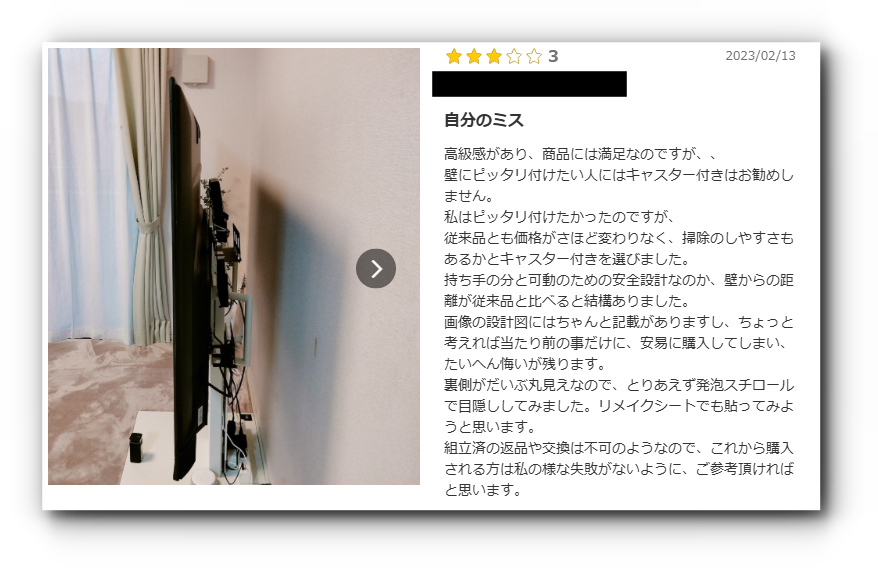 キャスター付きの構造上、壁から一定の距離が空くため、「壁掛けのように完全に密着させたかった人には不向き」「想像より壁との隙間ができた」と感じるケースがあるようです。