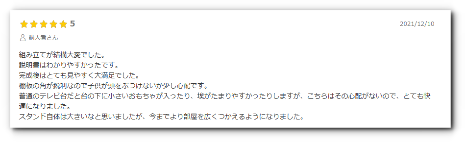 一方、悪い口コミは組み立てに時間がかかる点や、壁に完全に寄せられない構造に関するものが中心です。