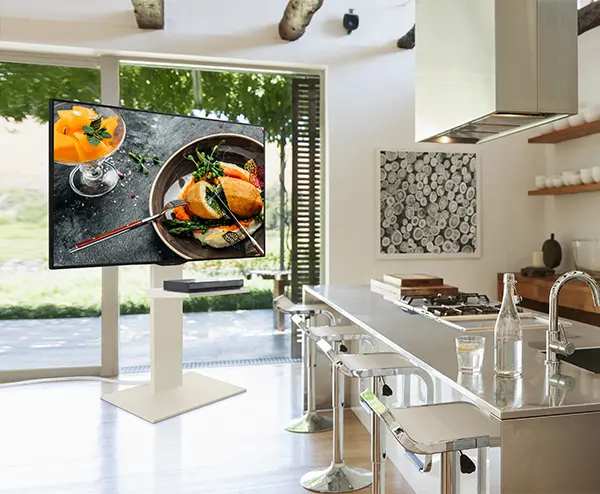 大型テレビに高さ調整と移動の自由を与え、立ったままの視聴やダイニングでの使用にも対応できるテレビスタンド。デザインにも磨きをかけたスタイリッシュなモデルが、WALL V5のハイタイプです。